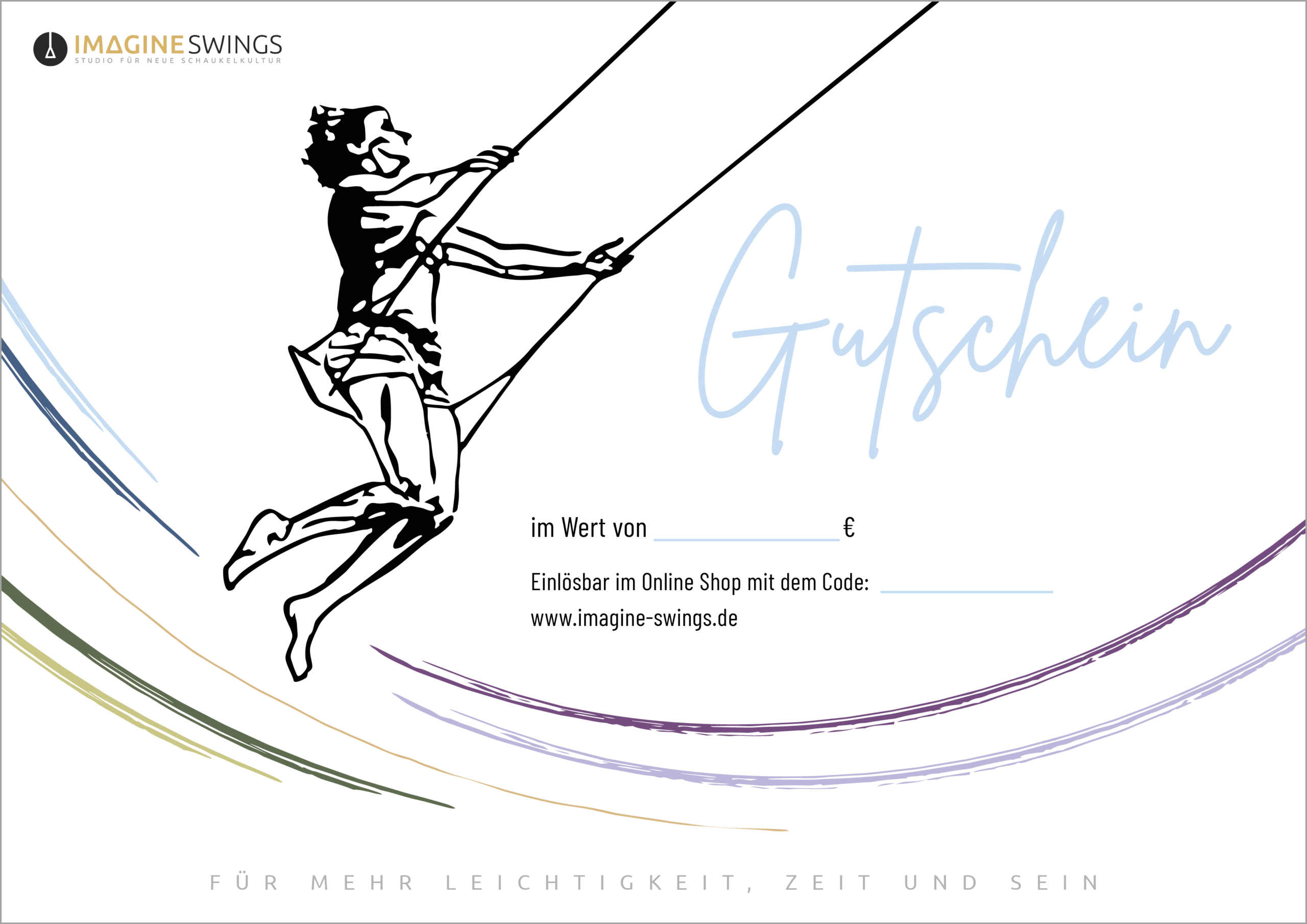 Verschenke Schaukel-Freude! Mit diesem Gutschein kann die beschenkte Person sich selbst ihre Lieblings-Schaukel oder eines der anderen Produkte aussuchen. Der Gutschein kann mit einem Geschenk-Code hier im Online Shop für alle Produktkategorien eingelöst werden.